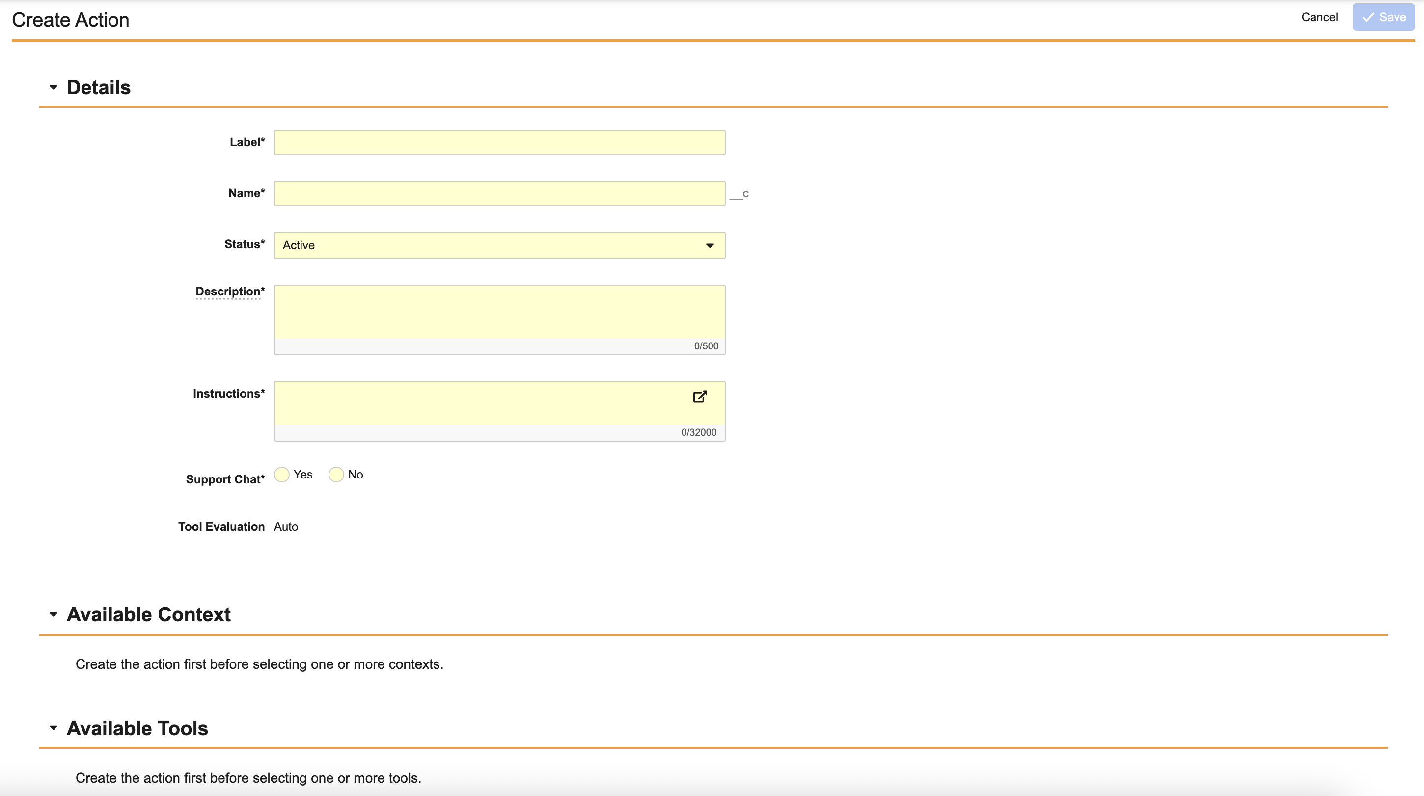 - Set the Status to Active or Inactive. By default, new Agent Actions are created in the Active status.