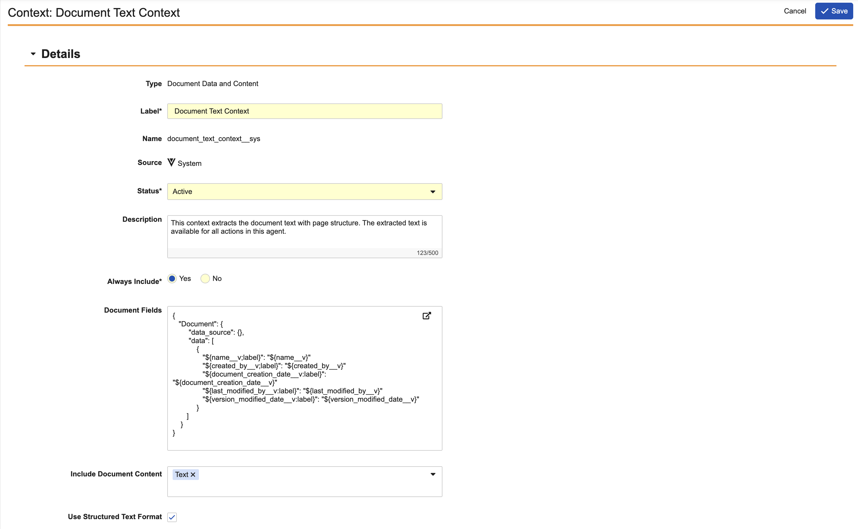 - Optional: Enter Document Fields using the Agent Context Output Template. Including document fields prompts the Agent Action to display the field label and values in the response. This field is required if you do not select an option from the Include Document Content picklist.