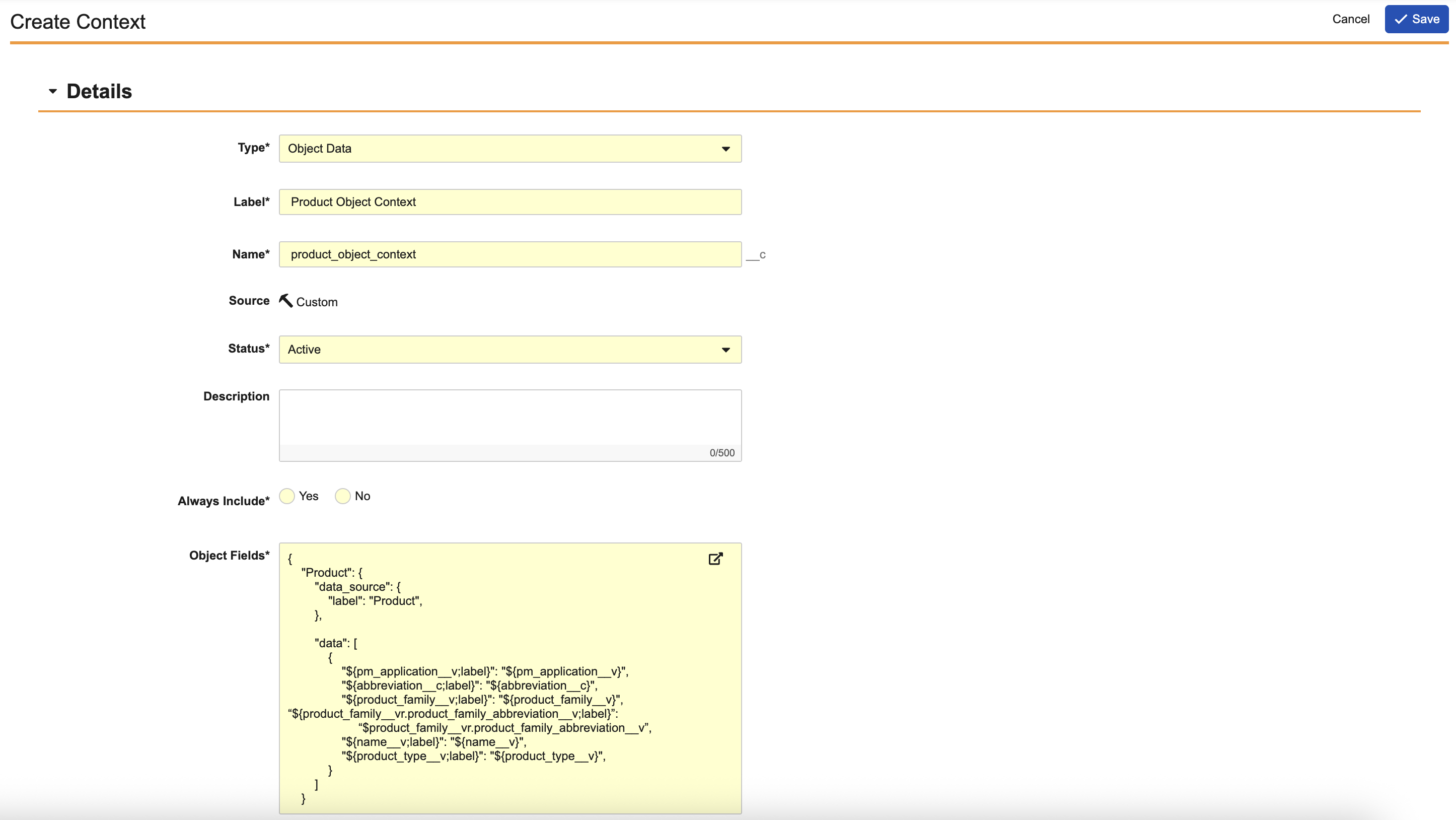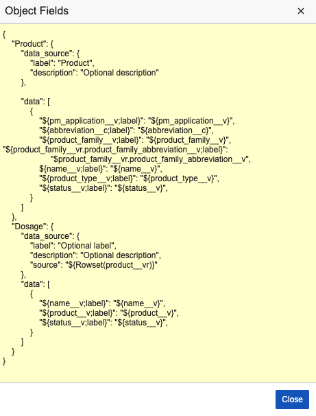 data_source: Include field labels and descriptions from the object or related objects, such as the Name, Description, or Label of inbound relationships. Thedata_sourceis only required at the top of the template if related objects (inbound relationships) are included. In this case, a source referencing the inbound relationship is required.data: Include the fields and their label from which the Agent Context will pull values. You can reference field values using${field_name}. You can reference field labels using${field_name;label}. You can reference field values and labels in outbound relationships using${outbound_relationship_name.field_name}or${outbound_relationship_name.field_label}.