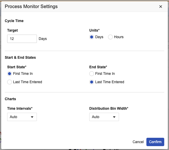 - Cycle Time Start: The lifecycle state of the start of the process. By default, the Cycle Time Start uses the first time a record entered the selected lifecycle state, but you can change this in the Process Monitor Settings dialog.