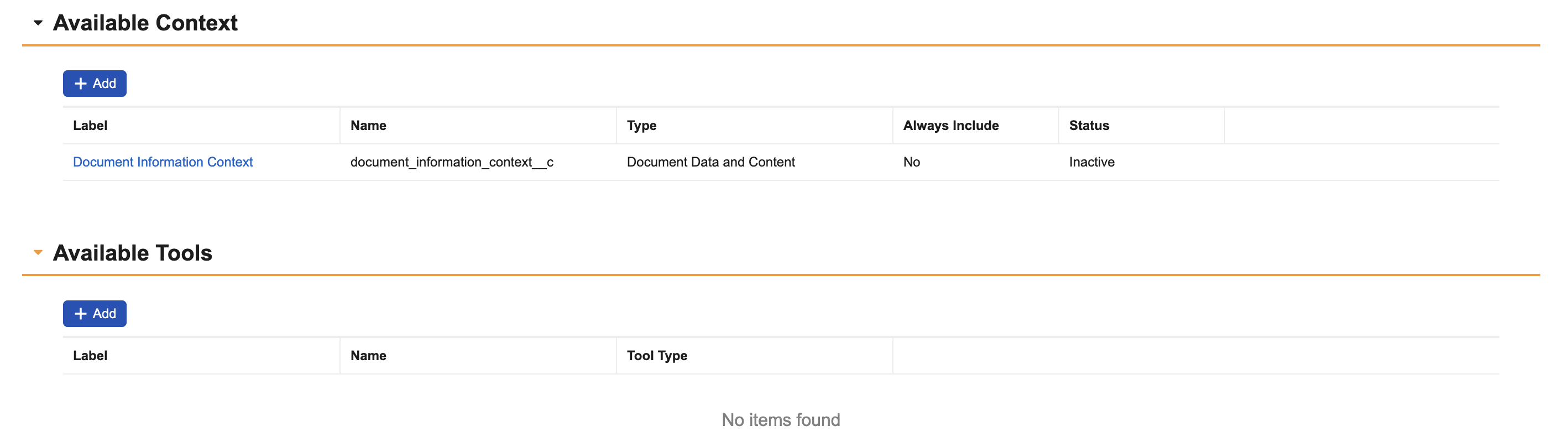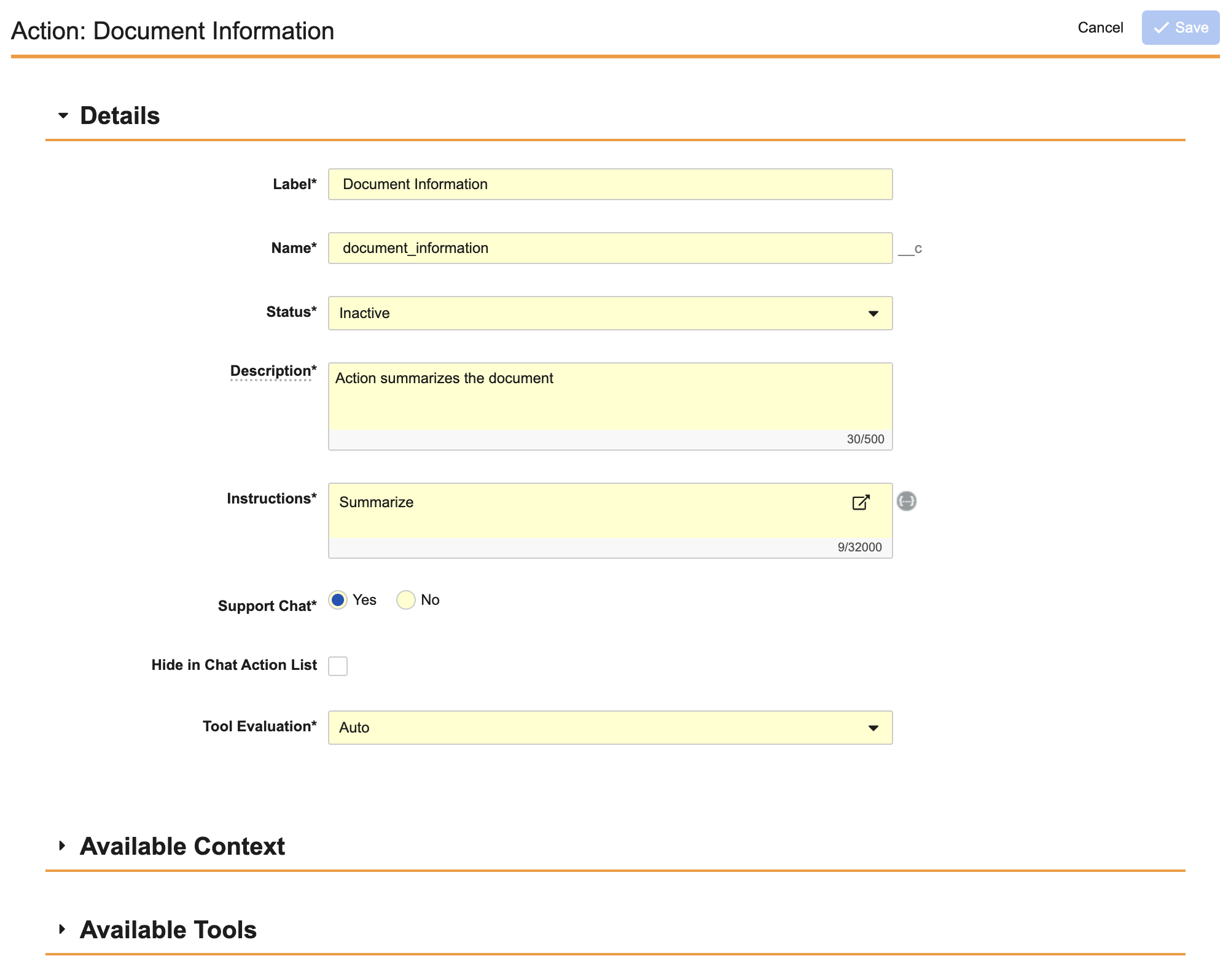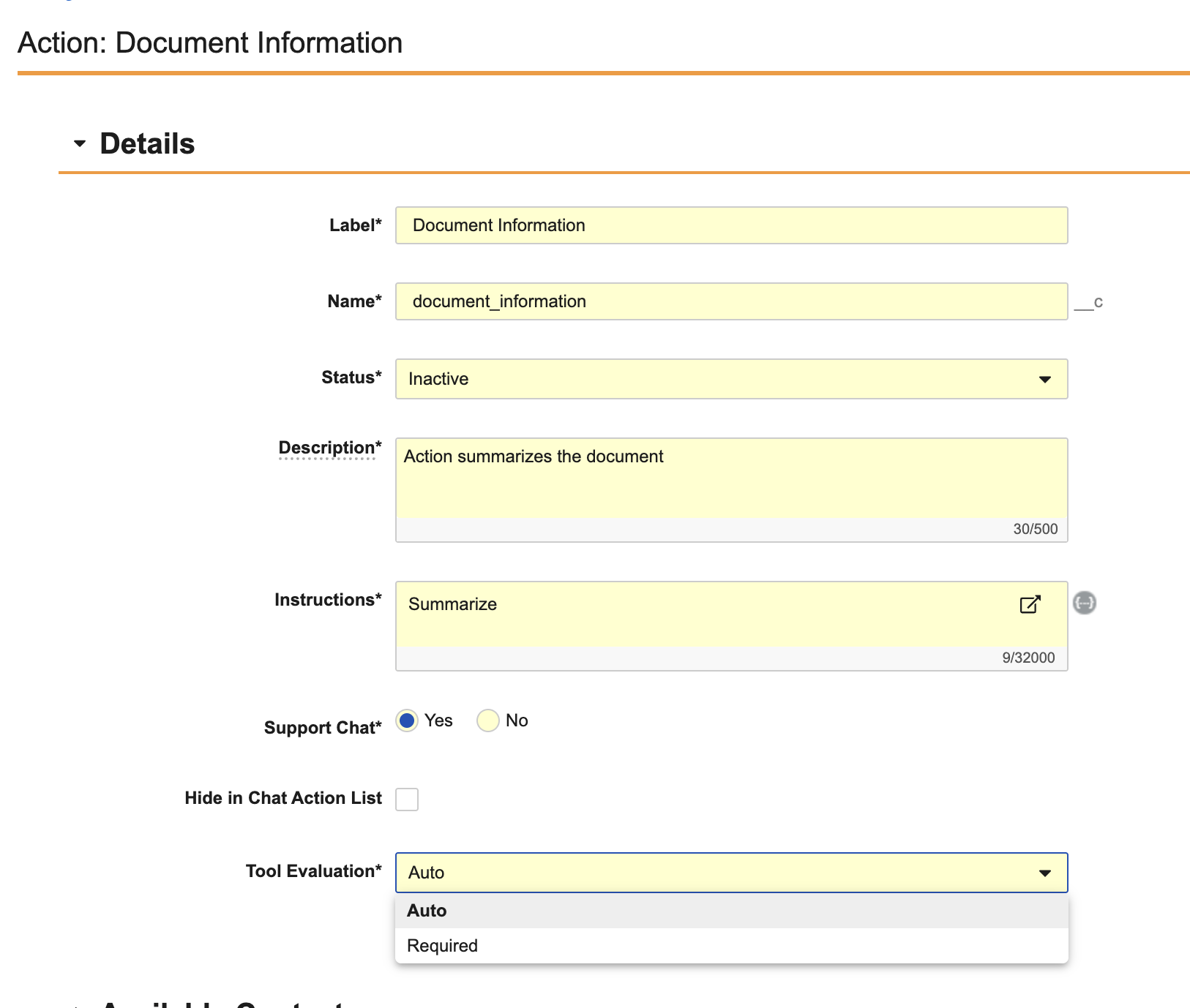 - On the Agent Action Configuration page, click Available Context or Available Tools.