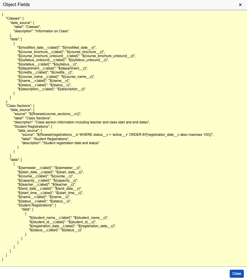 You can use the template to access child and grandchild records. For example, Class Section is a child of Class, and Student Registration is a child of Class Section. In this case, the template would appear as displayed in the image below.