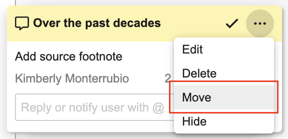 Annotations are attached to a specific location on a document. To move an annotation, select Move from the annotation’s Actions menu. Move the annotation to a new location and click Save () to save your changes, or Cancel () to cancel the move.
